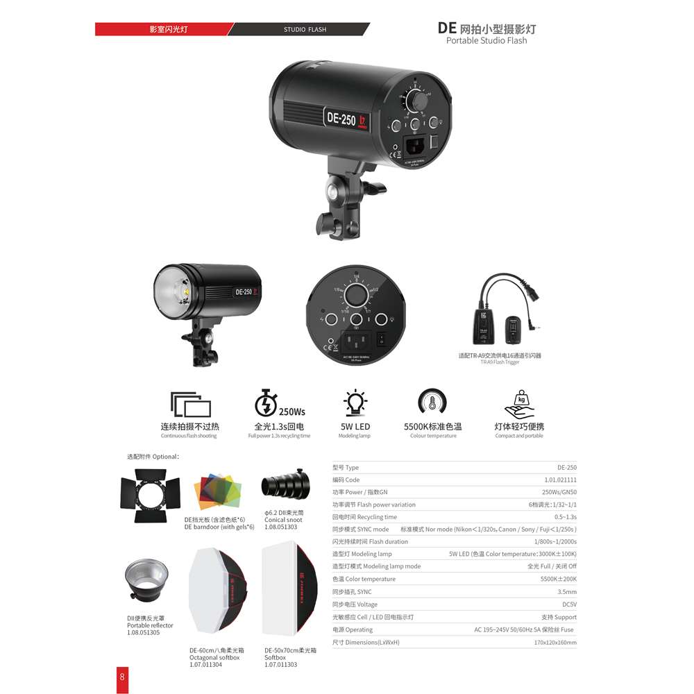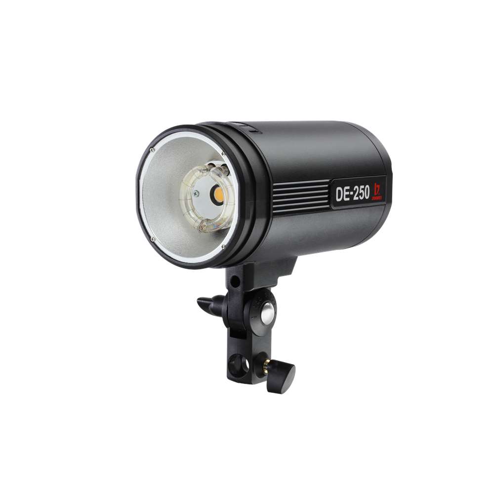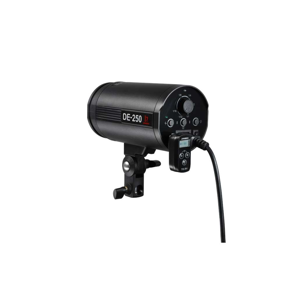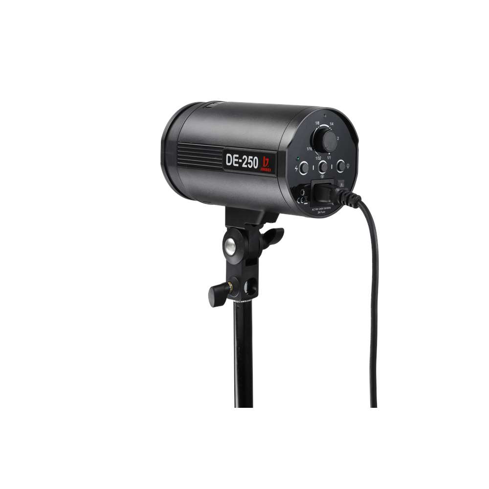 Jinbei DE-250. Αυτοκέφαλο στούντιο φλας ισχύος 250 W/s. Το DE-250 είναι πρόσφατη προσθήκη στη σειρά αυτοκέφαλων φλας της Jinbei και ενσωματώνει νέα, εξελιγμένη τεχνολογία φλασόλαμπας και κεντρικού πυκνωτή, ενώ είναι μικρότερο σε μέγεθος σε σύγκριση με το προκάτοχό του.