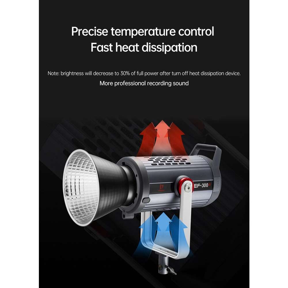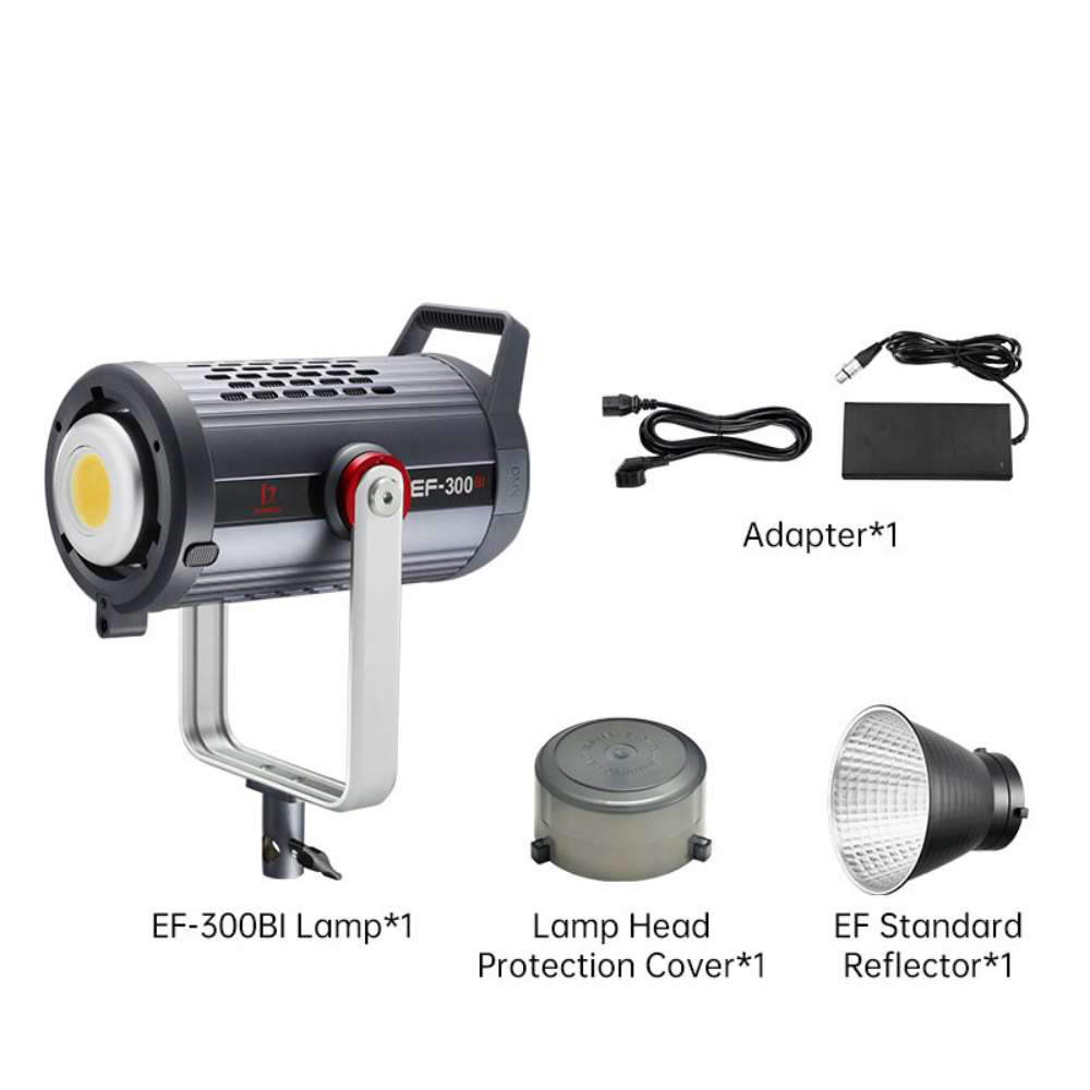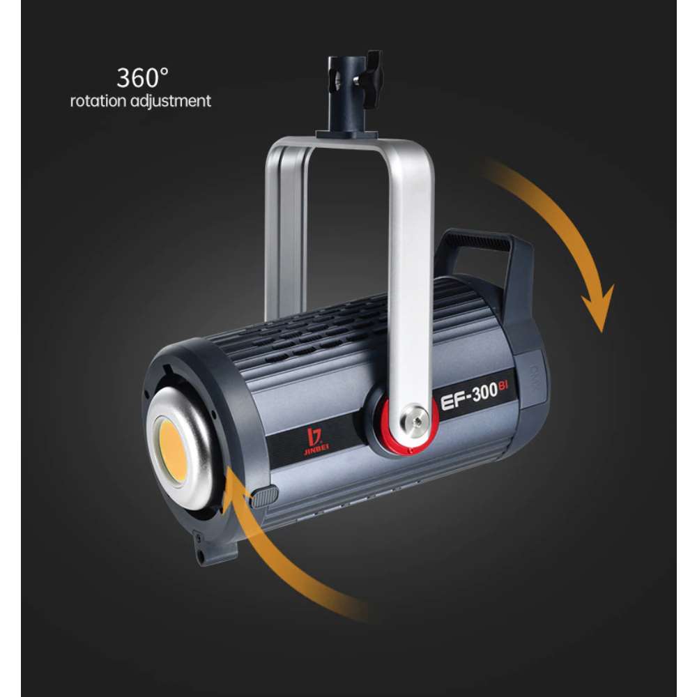 Jinbei EF-300BI LED. Επαγγελματικό αυτοκέφαλο φωτιστικό LED τύπου COB (Chips On Board) μεταβλητής χρωματικής θερμοκρασίας για χρήση σε εφαρμογές φωτογραφίας και video, με μοντούρα εξαρτημάτων τύπου Bowens S και ονομαστική ισχύ 300 W. Το Jinbei EF-300BI LED υποστηρίζει τρεις τρόπους ασύρματου τηλεχειρισμού.