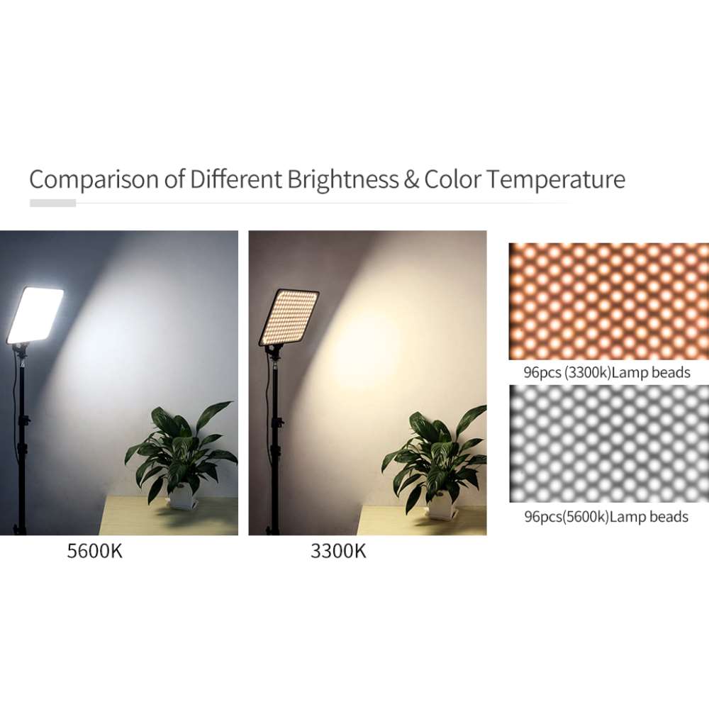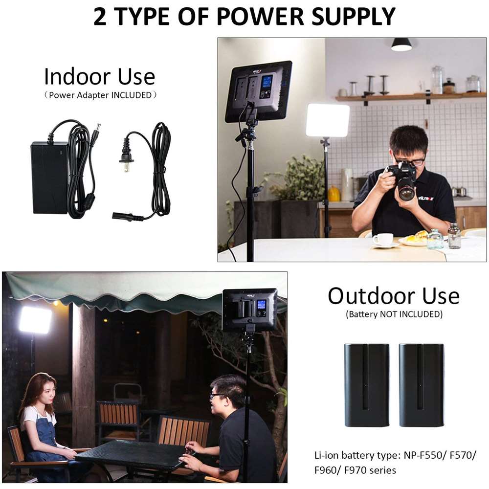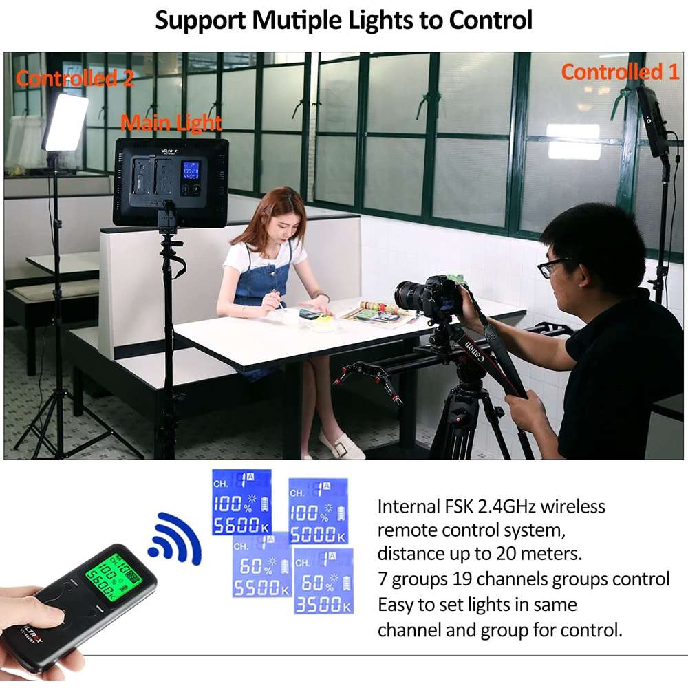 Viltrox VL-200T Bi-Color LED κιτ 3 μονάδων. Το Viltrox VL-200T Bi-Color LED κιτ 3 μονάδων αποτελείται από 3 φωτιστικά VL-200T Bi-Color LED panels ισχύος 30 W με αφαιρούμενη βάση για πέδιλο cold shoe, 3 τροφοδοτικά ρεύματος, 3 καλώδια τροφοδοσίας, 3 τρίποδα, 1 τηλεχειριστήριο και 1 τσάντα μεταφοράς.